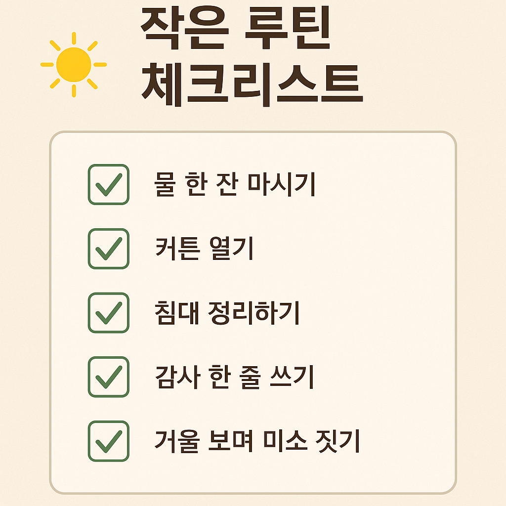 💡 모두 1~2분 안에 끝나서 실패 확률이 낮고, 아침이 서툰 사람도 부담 없이 매일 실천할 수 있습니다.