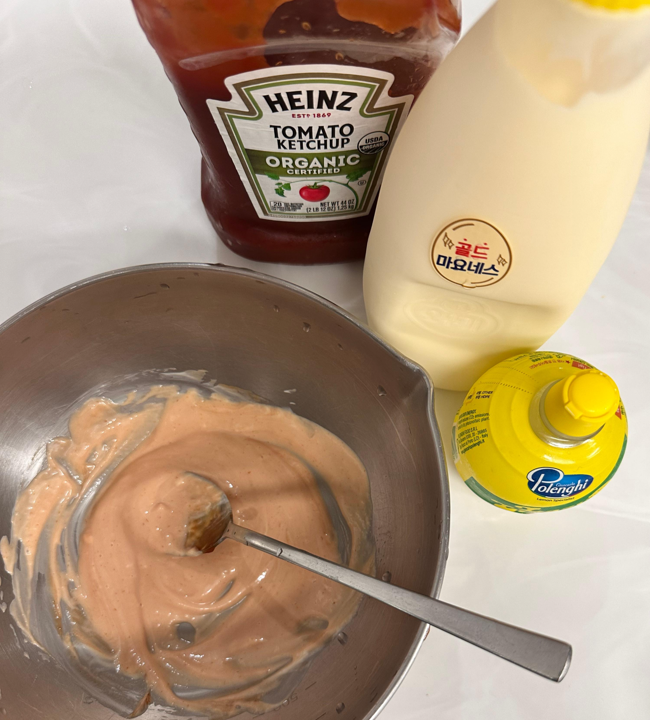 마요네즈 4큰술 + 캐찹 2큰술 + 레몬즙 1큰술 을 섞어 부드럽고 새콤달콤한 드레싱을 만듭니다. - 섞기